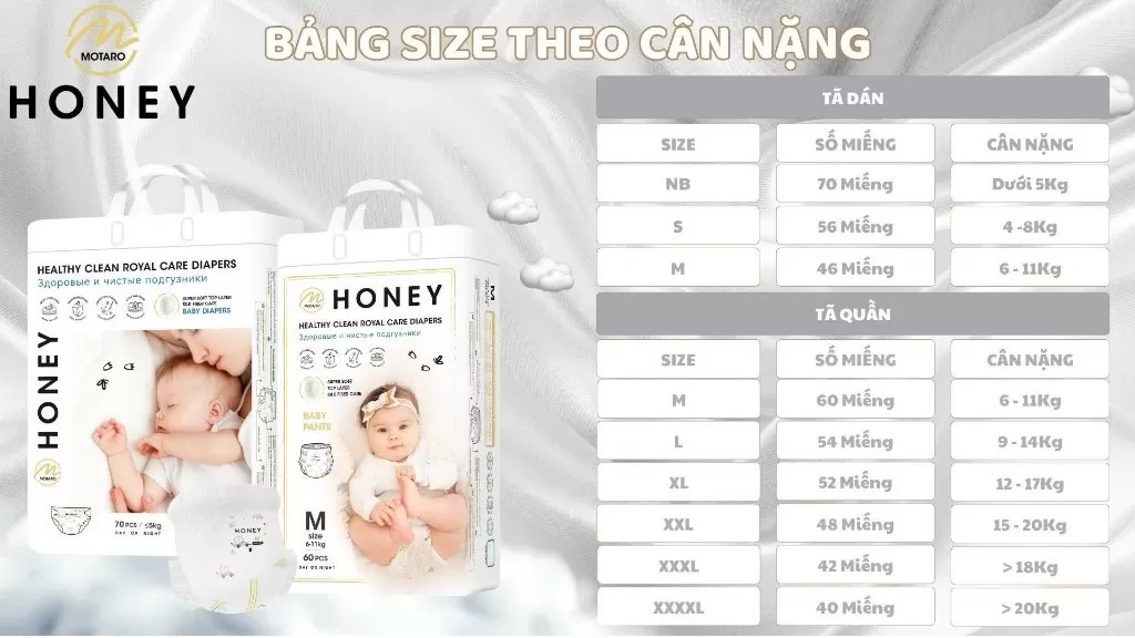 Mỗi hãng bỉm sẽ có tiêu chuẩn cân nặng cho từng size, Motaro gợi ý cho mẹ kích cỡ bỉm theo cân nặng của bé: