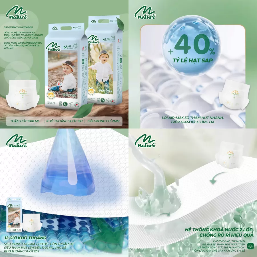 +40% hạt SAP siêu thấm: tăng khả năng hấp thụ, khóa ẩm nhanh.