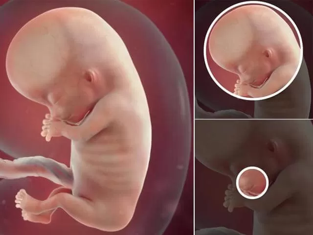 Đến thời điểm này, bạn nhỏ của mẹ mới chính thức được gọi là bào thai. Tuần này, khuôn mặt của bé rất rộng, đôi mắt tách biệt, mí mắt hợp nhất và đôi tai hạ thấp. Chồi răng xuất hiện. Các tế bào hồng cầu đang bắt đầu hình thành trong gan của bé. Đến cuối tuần này, cơ quan sinh dục ngoài của bé sẽ bắt đầu phát triển thành dương vật hoặc âm vật và môi âm hộ.