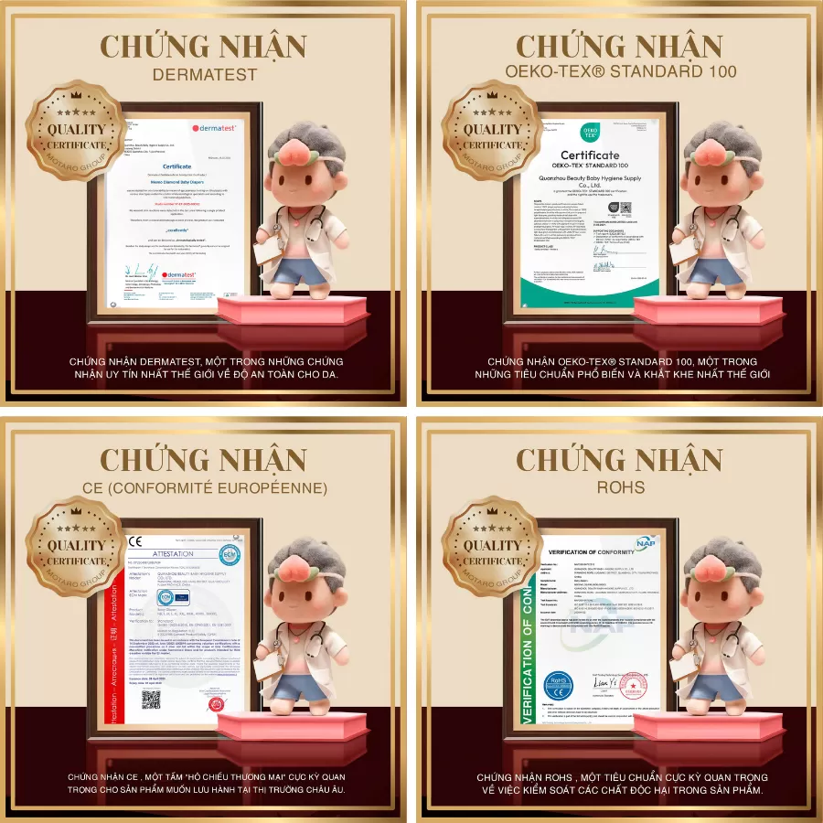 Các dòng sản phẩm tã bỉm thuộc hệ sinh thái Motaro đã đạt được nhiều chứng nhận từ các tổ chức kiểm định uy tín trên thế giới: