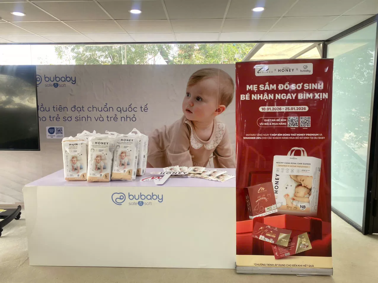 Khi khách hàng phát sinh đơn hàng tại showroom BU Baby, bé sẽ được tặng 01 hộp bỉm Motaro Honey Premium kèm voucher mua hàng, giúp cha mẹ có thêm cơ hội trải nghiệm sản phẩm chăm sóc làn da bé ngay trong sinh hoạt hằng ngày.